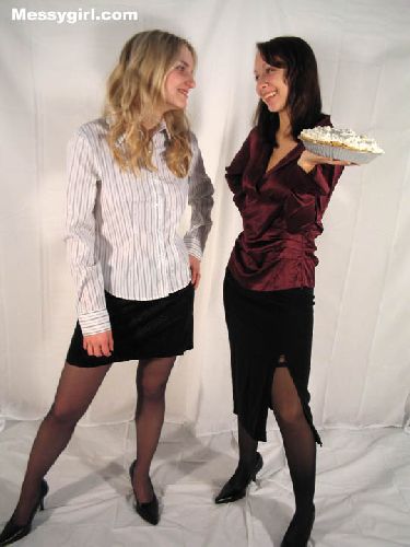 Liz and Lexi are dressed as sexy business girls. Both girls have an attitude because they applied for the same job. It doesn’t take long for the first pie to be thrown! Lexi pies Liz and then it’s on! Both girls go at it in with pies, slime and chocolate head dunking. They finish topless and covered head to toe!