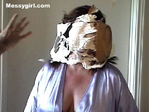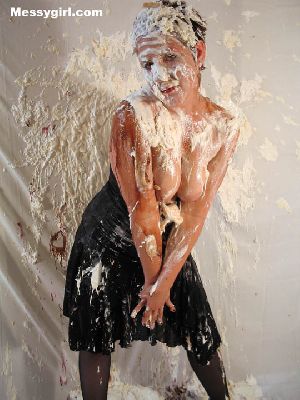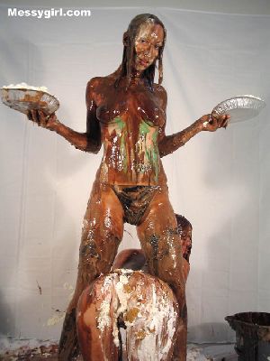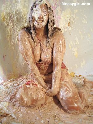 Messygirl starts out in her silk robe, black panties and bra. She is hit with cream pies and chocolate syrup poured over her pretty face.