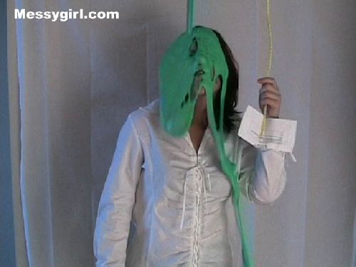 Raven is in her long sexy red teddy as she pulls the rope for her sliming. Then she pies her face and 38E breasts and goes head dunking in pudding! She also takes off her panties and pies herself between the legs!