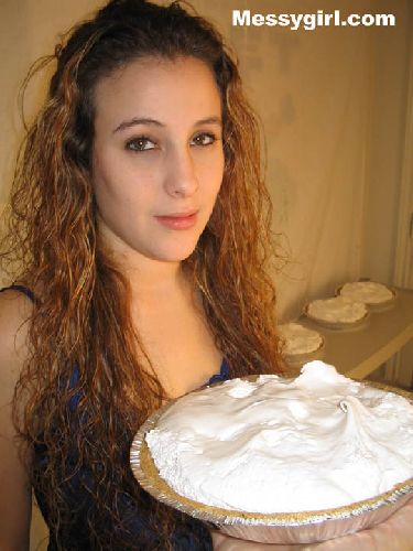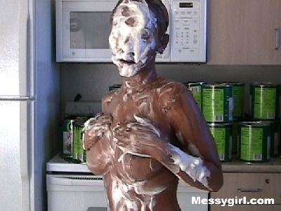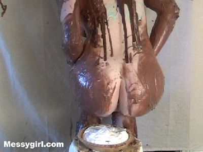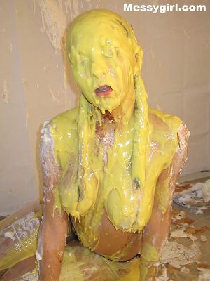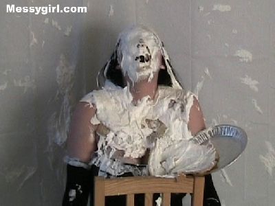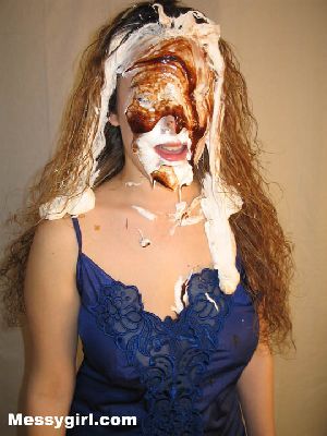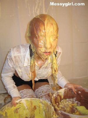 Raven enjoys her first messy session in and out of her body stocking. She is covered in pies, batter and chocolate syrup!