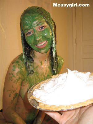 Nikki slops it up in pudding, slime and pies. She starts out in her sexy bikini, but soon goes nude for pie sitting and head dunking in a bucket of slime!