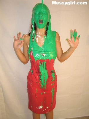 Lexi is covered in pies, slime and chocolate syrup while wearing her sexy red dress.