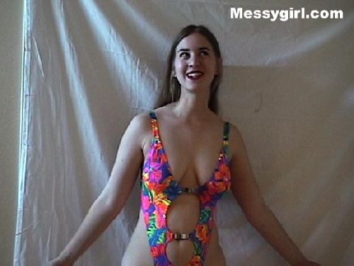 Sara puts on her tiny pink thong bikini for some pie and slime play.
