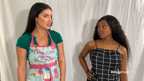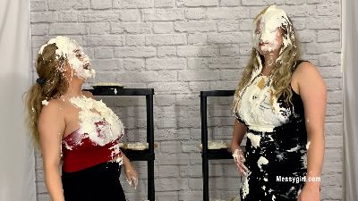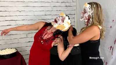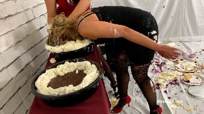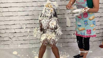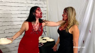 Priscilla meets Penelope for the first time. They are well dressed in the dessert line and Priscilla is taking too much time to decide what she wants. Penelope becomes annoyed and pushes Priscilla to hurry up. Well, this sets off a classic tit for tat messy fights between them. Both girls go at it hard and messy with pies to the face, batter pours and face dunks. Lots of hair pulling too.