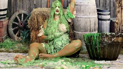 Alice is topless, gagged and has her wrist bound as she gets the sliming of her life. She even becomes aroused from it.