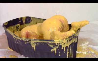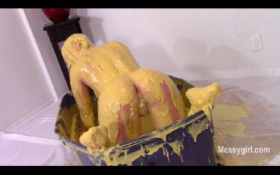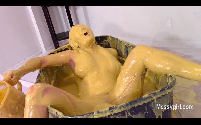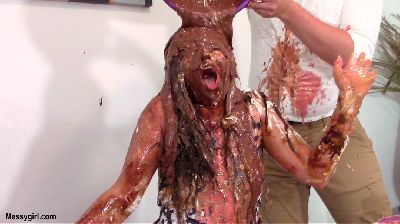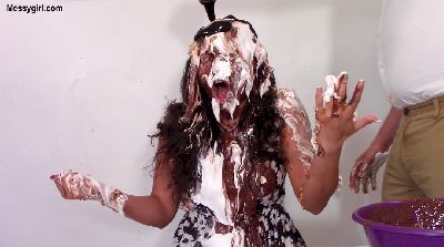 Husband sacrifices his Asian wife, Katy, to Amy, fulfilling his dirty desire for lesbian fun. Amy pies this cutie till she loses count and submerges her beautiful face in buckets of chocolate batter. Amy then pours the batter over Katy`s head and rubs butter cream on her tits and lips. Before you know it, Katy is totally covered head to toe in the mess. Amy finishes her off with a cream slime pour. Katy also gets spanked and has her hair pulled, making her an official MessyGirl.