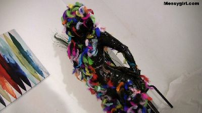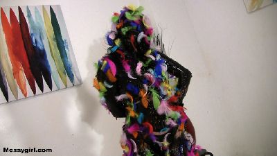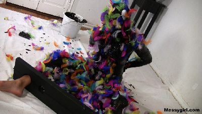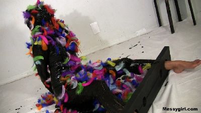 Alana is very excited to do her first custom, until she finds out it`s tar and feathers. But since it's a custom, she needs to do it. She is stripped down to her bikini, gagged, put in ankle stocks, and her hands are tied behind her back. She then has a bucket of black grease dumped over her head. The grease is then smeared all over her body and face. Once that is done, the colorful feathers are poured over her. You will enjoy the transformation,