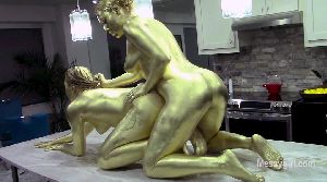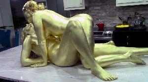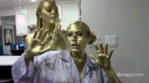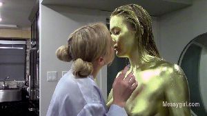 Amy and her genie Vika are relaxing on the sofa. Amy wants to know what it would be like to have the midas touch of gold. So Vika sucks Amy's finger and tells her she can now turn anything into gold. Amy touches a lemon on the table and it turns into gold. Amy then tells Vika to strip for her and pose like a statue. She then touches Vika's tummy and she turns into a golden statue. Amy is amazed as she walks around her golden genie. Amy kissses her all over and this wakes Vika up. Vika is amazed as well, but wants Amy to becomes a golden statue like her. So she points at Amy and she becomes a statue too. Vika wakes up Amy by kissing her all over. Vika then tells Amy she will show her how statues make love. You also get behind the scenes footage of the girls painting themselves.