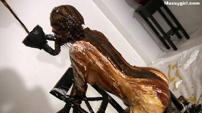 Vika pushes her limits in this one. She is gagged, tied to a chair backwards and nude. She then gets covered in all kind of savory items. She has a container placed on the floor just below her ass. The slop flows down her back and into the container. She then has the force feeder attached to her mouth and has the slop poured down her throat. Extreme WAM at its best.