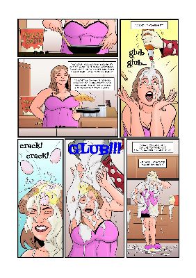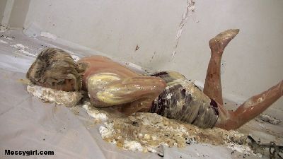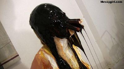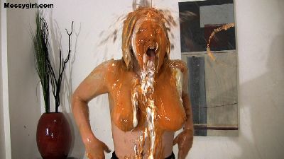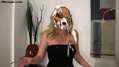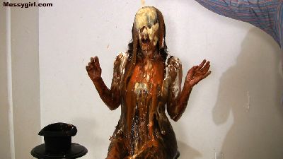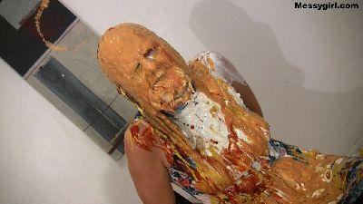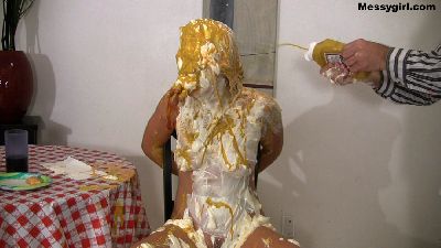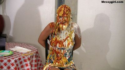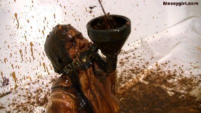 Amber is the first contestant of the Messygirl Extreme Games. She has to draw from a hat that contains pieces of paper with a dollar sign and the letter M for mess. Each dollar sign is worth $25, but if she picks the letter M, she will suffer a messy fate. She starts out well, with two dollar signs in a row, but then the first M is picked, and she gets a pie to the face. She suffers the same fate with various messes, such as beans, tomato soup, custard, flour and even treacle. She is still winning, but getting destroyed at the same time. Then she has to decide if she wants to go double or nothing. She takes on the bet, but loses, and now must suffer a sloppy humiliation. She is now nude and in the ankle stocks, with the force feeder funnel in her mouth. Next comes the slop mixture poured over her head and down her throat. Poor Amber sounds like a backed up sink from all the gurgling noises she makes.