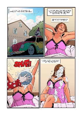 It's "The Auntie Emma's Playhouse Show" starring Emma and co starring Bobo the Bear. Emma welcomes the viewers and tells them the show is brought to them by the letter P and number 10. She tells Bobo she wants him to help her by showing what begins with the letter P. He shows a pencil and then ten pencils. That is followed with ten sheets of paper. Then he shows a pie, but Emma wants to know if he has ten pies. That turns out to be the wrong thing to ask, because Bobo proceeds to slam 10 pies hard into Emma's face. He even adds an 11th pie for good measure. Emma is pissed and fires Bobo on the spot. This makes Bobo very mad. So he strips Emma's top off and pours green slime over her head. Bobo even grabs her tits a few times during the assault. The scene cuts abruptly with a technical difficulties notice. When the cameras are back on, we see Emma trying to clean off, but soon discovers that she is becoming aroused. She then preforms for the camera with her new show "Auntie Emma After Dark".