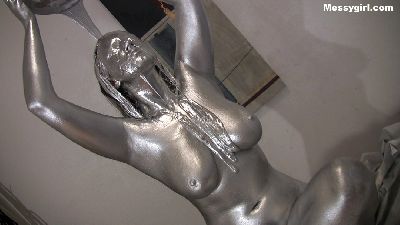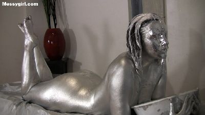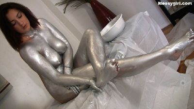 Busty Jacy does her very first metallic paint shoot. We gave her a large bowl of silver paint and told her to go for it. The camera captures her covering every inch of her sexy curvy body. A mirror is near by so that she can watch the progress.