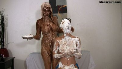 Amy and Penelope get playful and naughty with 7 large sheet cakes. Both girls are topless and wearing white pantyhose. Very hot stuff!