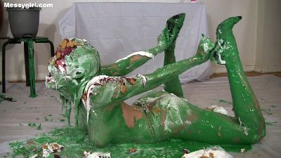 Amy is in a tight dress and heels as she gets ready to sit on a pie. Once her ass gets a nice creaming, she continues to slop herself up. She first covers her legs and heels in the cream and green slime. She then pours the slime over her head and rubs it all over herself. She takes off the dress, and rubs the mess all over her tits and pussy. Then she gets on all fours for pies to her face and ass. While still on the floor, she grabs her heels so that her face is lifted up for another pie to the face. She then brings herself to a few orgasms as she uses a vibrating toy on her messy pussy.