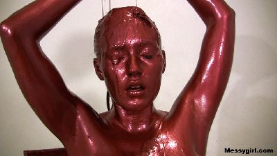 Amy covers herself head to toe in red russet metallic paint. She then plays with her slippery painted pussy and asshole until she cums. Then she literally fucks a chair by sliding up and down the slippery seat.