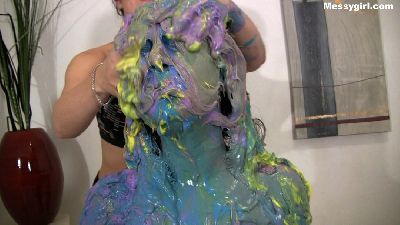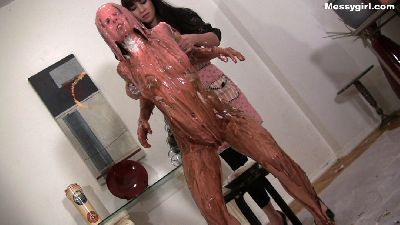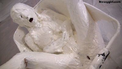 Penelope starts out nude and goes head first in the 5 gallon bucket of sticky fluff. She then starts to coat her sexy body and face until she is an unrecognizable blob. Once covered, she masturbates until she cums.