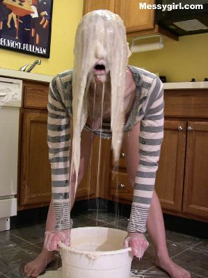 Liz does some extreme head dunking in heavy cream. She ends up nude and covered head to toe in the slippery stuff.