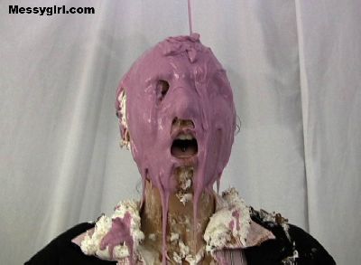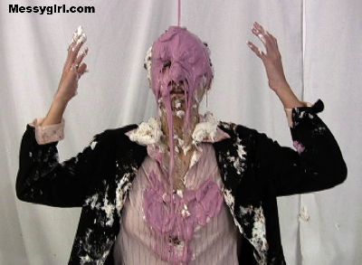 Lane's relaxing shower turns into a pie attack. She takes the pies hard to the face. She then gives in and plays in the pie mess.