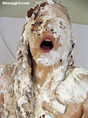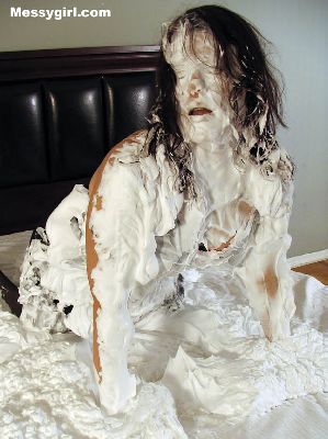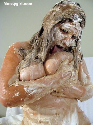 Mila is a very naughty Messygirl as she plays with 2 large dildos while she gets pied and slimed.