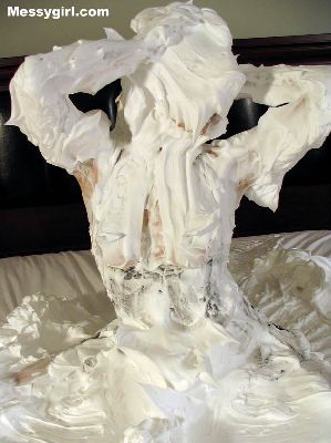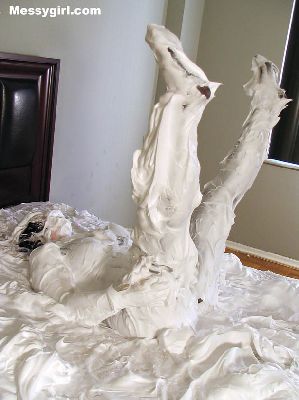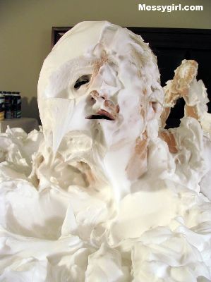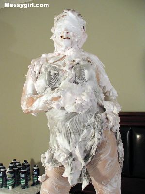 Linda dives face first into a bed of shaving cream. She rolls around until she is covered head to toe.