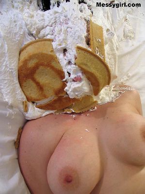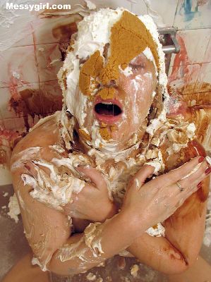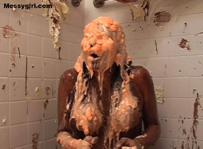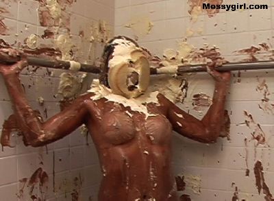 Tomiko's relaxing shower turns into a non stop pie attack. She ends up rubbing the pie slop all over herself.